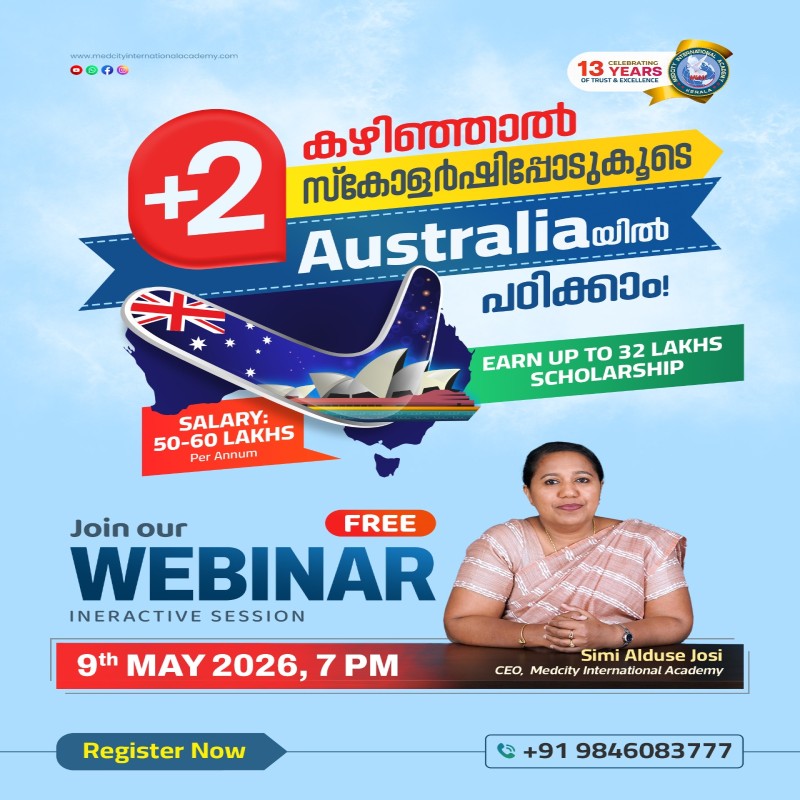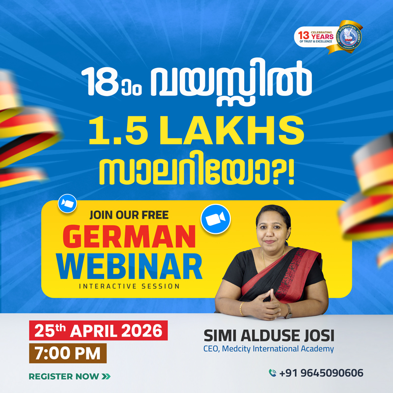 Medcity International Academy’s German Seminar at Kollam witnessed an overwhelming turnout, with over 1,300 students attending in a packed auditorium. Representatives from several nursing colleges were present. The seminar explored career pathways to Germany, featured live interaction with students currently in Germany, and awarded scholarships to 20 aspiring candidates.
